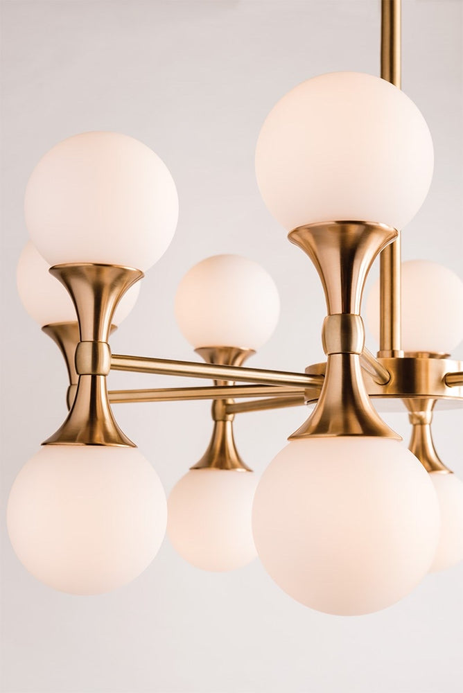 Bubbles of light balance on and balloon forth from trumpets of Aged Brass metal. Opal-etched glass diffusers poise in balanced rows, above and below, along a wheel of light, concealing warm, dimmable LED bulbs . Showcase this wonderful ceiling pendant above your dining table or to let the fitting take center stage in your living room
